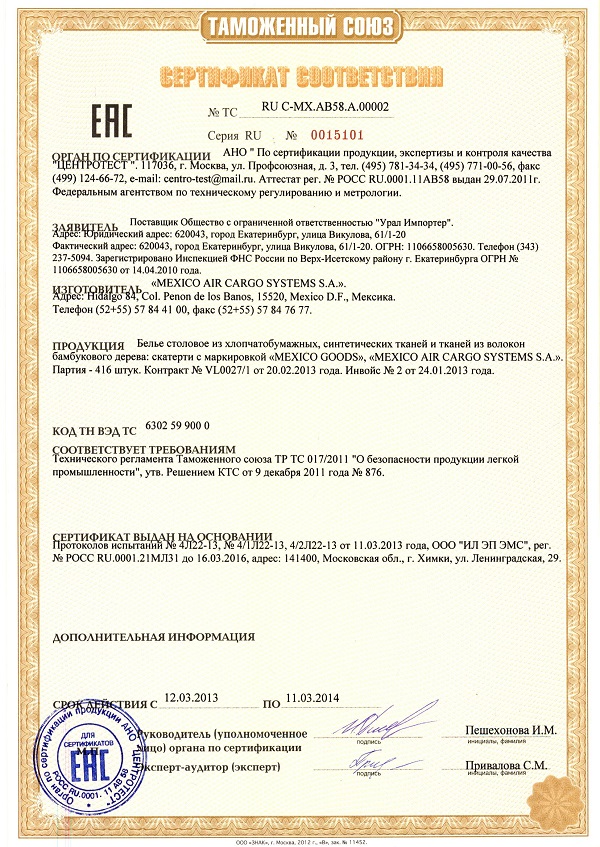 Сертификат по техрегламенту Таможенного союза — документ, который подтверждает, что продукция прошла процедуру оценки подтверждения соответствия, на требования безопасности всех распространяющихся на нее технических регламентов ТС.